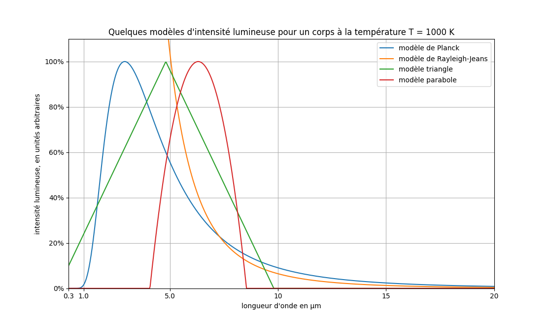 Dans cet ancien modèle historique, plus la longueur d'onde est faible, plus l'intensité lumineuse est élevée. Celle-ci peut atteindre des valeurs infinies.
